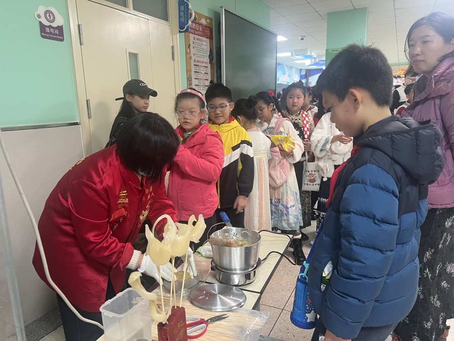 操场上更是热闹非凡。巨型经典动画形象合影板前,孩子们争相驻足打卡,摆出各式可爱姿势,用镜头定格这份专属的新年快乐;烤肉的焦香、冰糖葫芦的酸甜、老式爆米花的醇厚在空气中交织,特色美食摊位前排出的长龙,成为校园里最具烟火气的风景线;体能乐园内,孩子们奔跑跳跃、嬉戏追逐,尽情释放童真活力。与此同时,各楼层转角处的非遗展演区同样人气高涨,皮影戏的光影流转、捏面人的惟妙惟肖、糖画的晶莹剔透、川剧变脸的神秘奇幻、吹糖人的精巧灵动,非遗传承人现场展演教学,让孩子们在近距离观赏与互动中,触摸传统技艺的匠心温度,感受中华传统文化的独特魅力。